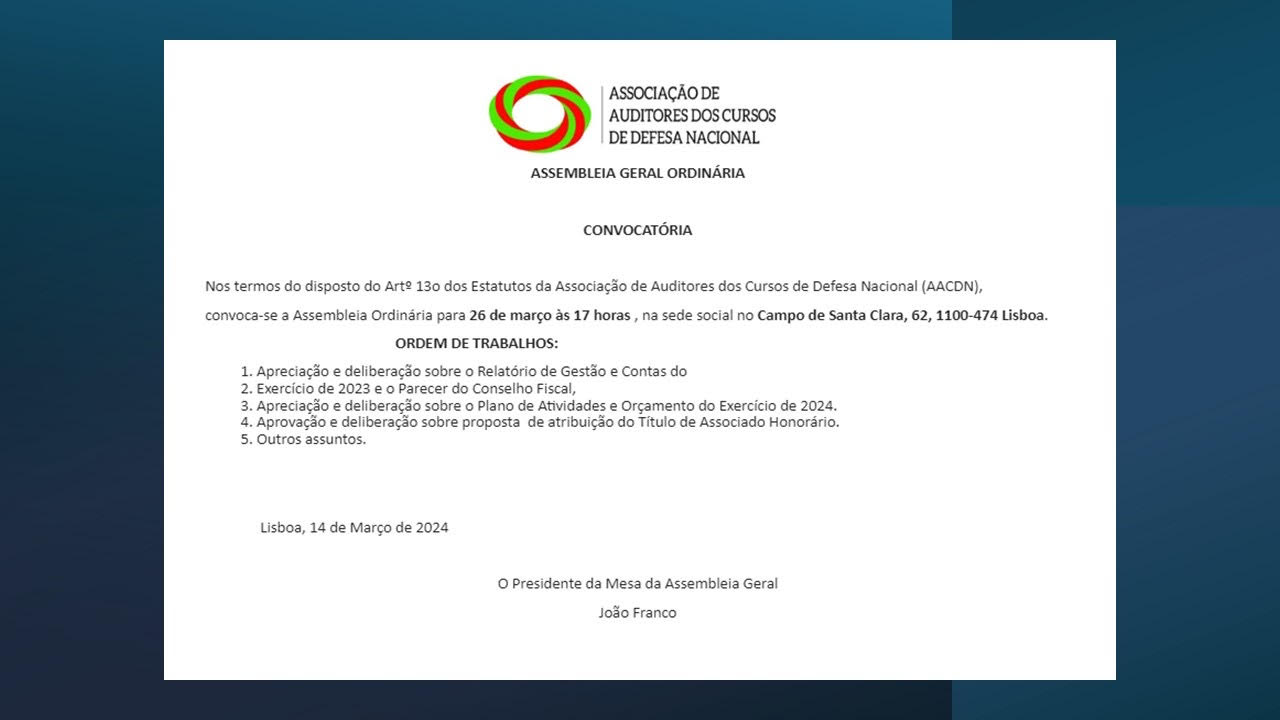 Nos termos do disposto do Artº 13o dos Estatutos da AACDN convoca-se a Assembleia Ordinária para 26 de Março às 17 horas, na sede social no Campo de Santa Clara, 62, 1100-474 Lisboa